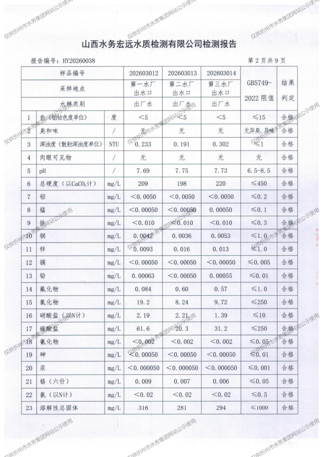 忻州城區(qū)公共供水水源水、出廠水、管網(wǎng)水、管網(wǎng)末梢水2026年3月份水質(zhì)信息公示