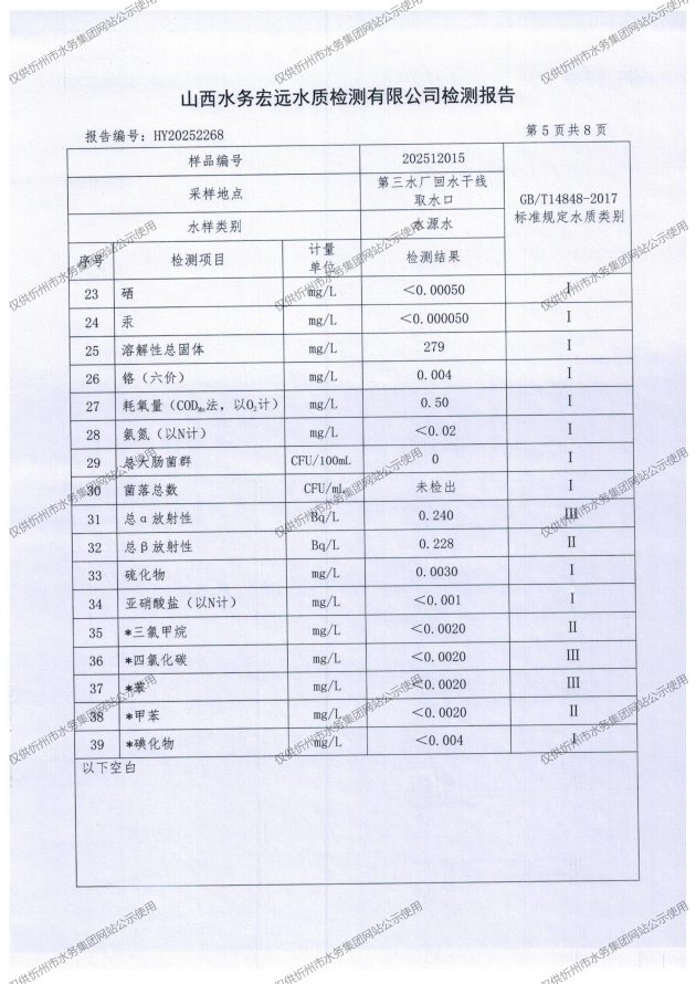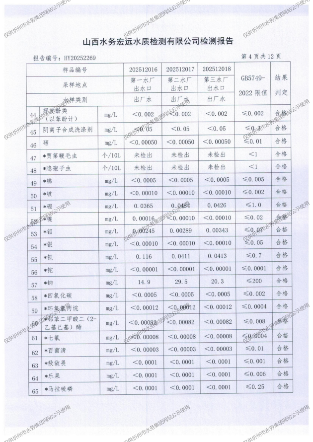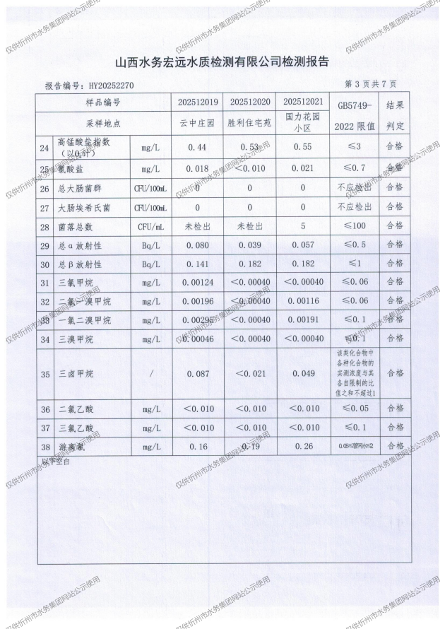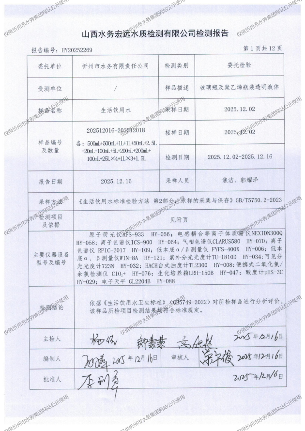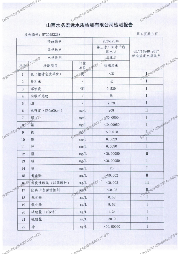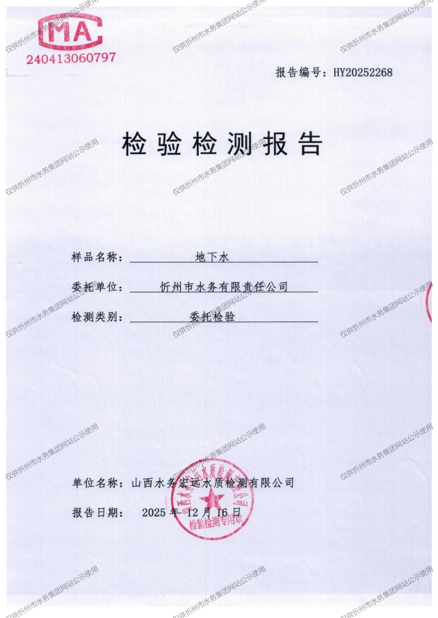 忻州城區(qū)公共供水水源水、出廠水、管網(wǎng)水、管網(wǎng)末梢水2025年12月份水質信息公示