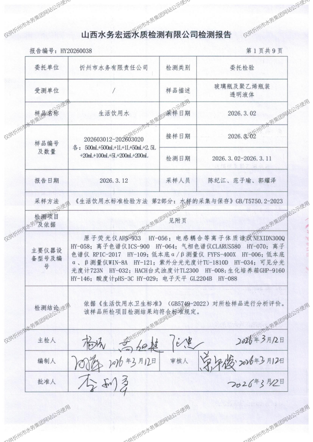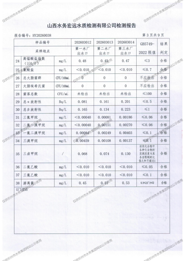 忻州城區(qū)公共供水水源水、出廠水、管網(wǎng)水、管網(wǎng)末梢水2026年3月份水質(zhì)信息公示